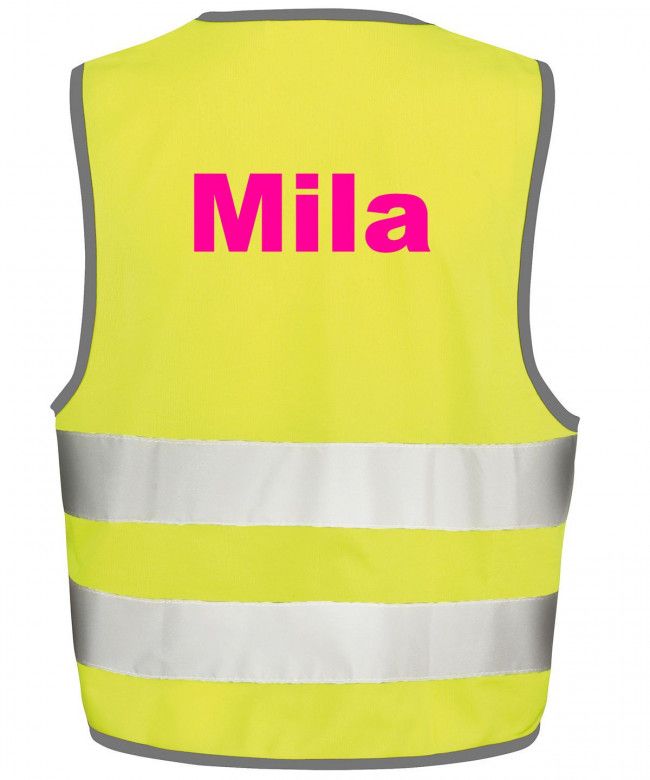 Veiligheidshesje fluo met naam bedrukt. Wel zo veilig: laat je kind fietsen met een veiligheidshesje aan. Zo is hij/zij duidelijk zichtbaar in het verkeer. Fijn model met klitteband!